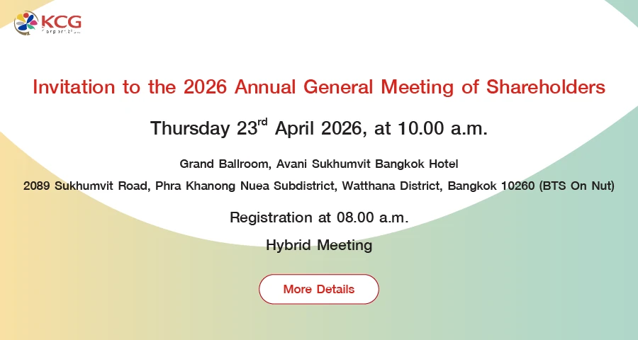 KCG Corporation Plc. (KCG) operates business in manufacturing and distributing products for consumption covering activities from research and development process to create production formula, procurement of raw materials, product manufacturing, distribution, and transportation to customers domestically, as well as exporting products to other countries. The Company is also an importer and distributor of leading products from overseas to Thailand.