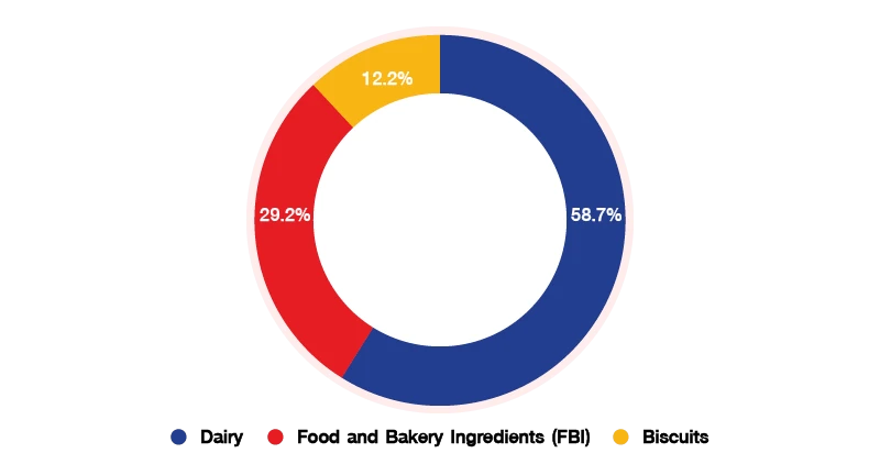Answer The Company is the market leader in both the butter and cheese product categories. Its Butter and Spreads products hold the No. 1 market share at 46.5%, while its Cheese products hold the No. 1 market share at 38.9%. For Sweet Biscuits, the Company also ranks No. 4 with a market share of 6.1%.