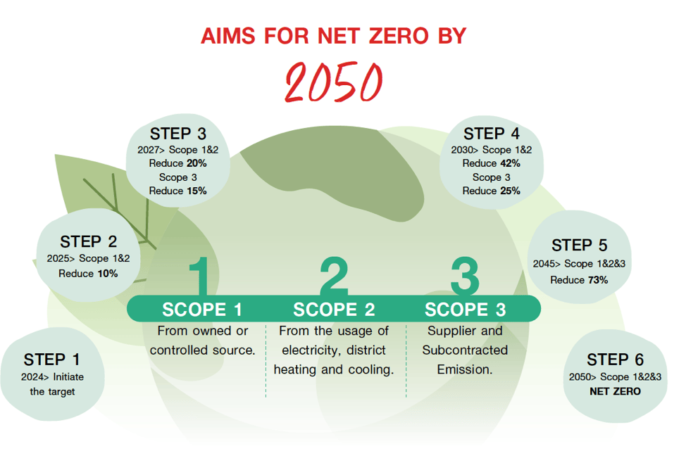 The Company is actively planning its transition toward Net Zero emissions in both the short- and long-term, following its Net Zero Target and Roadmap. By 2025, the focus is on energy and waste management to achieve a 10% reduction in Scope 1 & 2 within its own operations from the base year 2024 and find a strategic approach to reduce Scope 3 emissions, which may require strengthened collaboration with suppliers.