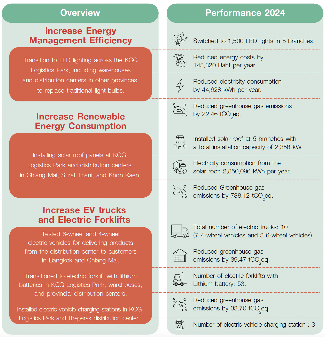 The Company implemented environmental and supply chain management plans aimed at reducing greenhouse gas emissions by increasing the use of renewable energy, particularly solar energy, and improving supply chain management, especially in transportation and storage, under the concept of Green Logistics in order to support environmental strategies and energy management to reduce greenhouse gases. The projects are as follows: