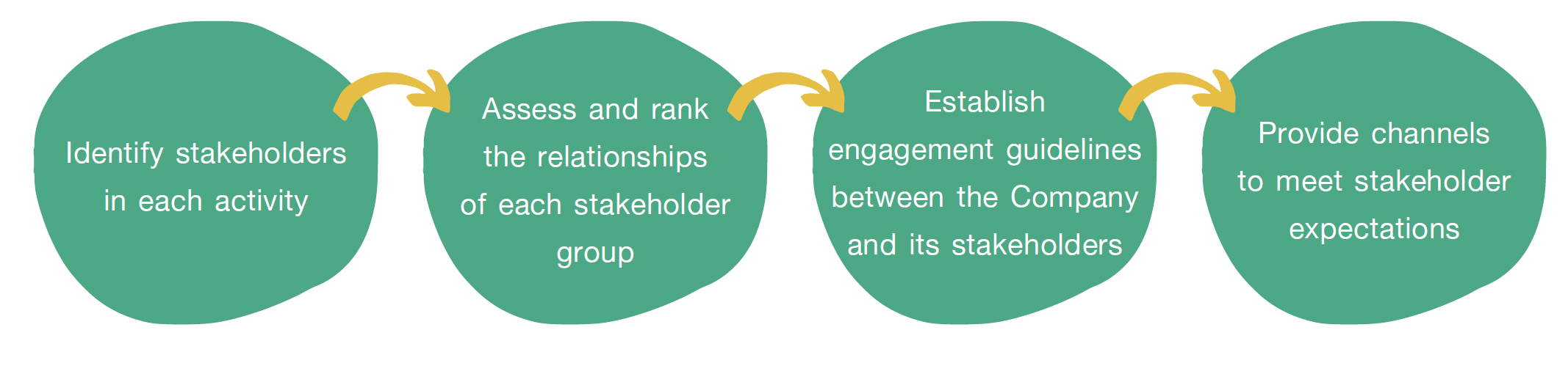The Company identifies stakeholder groups involved in business value chain activities. Then, analyze and rank stakeholder relationships based on their influence on the Company and the potential impacts on stakeholders in order to establish engagement guidelines between the Company and stakeholders, respond to stakeholders’ expectations or needs, and provide communication channels that are easily accessible and appropriate for each stakeholder group. This includes implementing a mitigation plan for stakeholder groups and the Company.