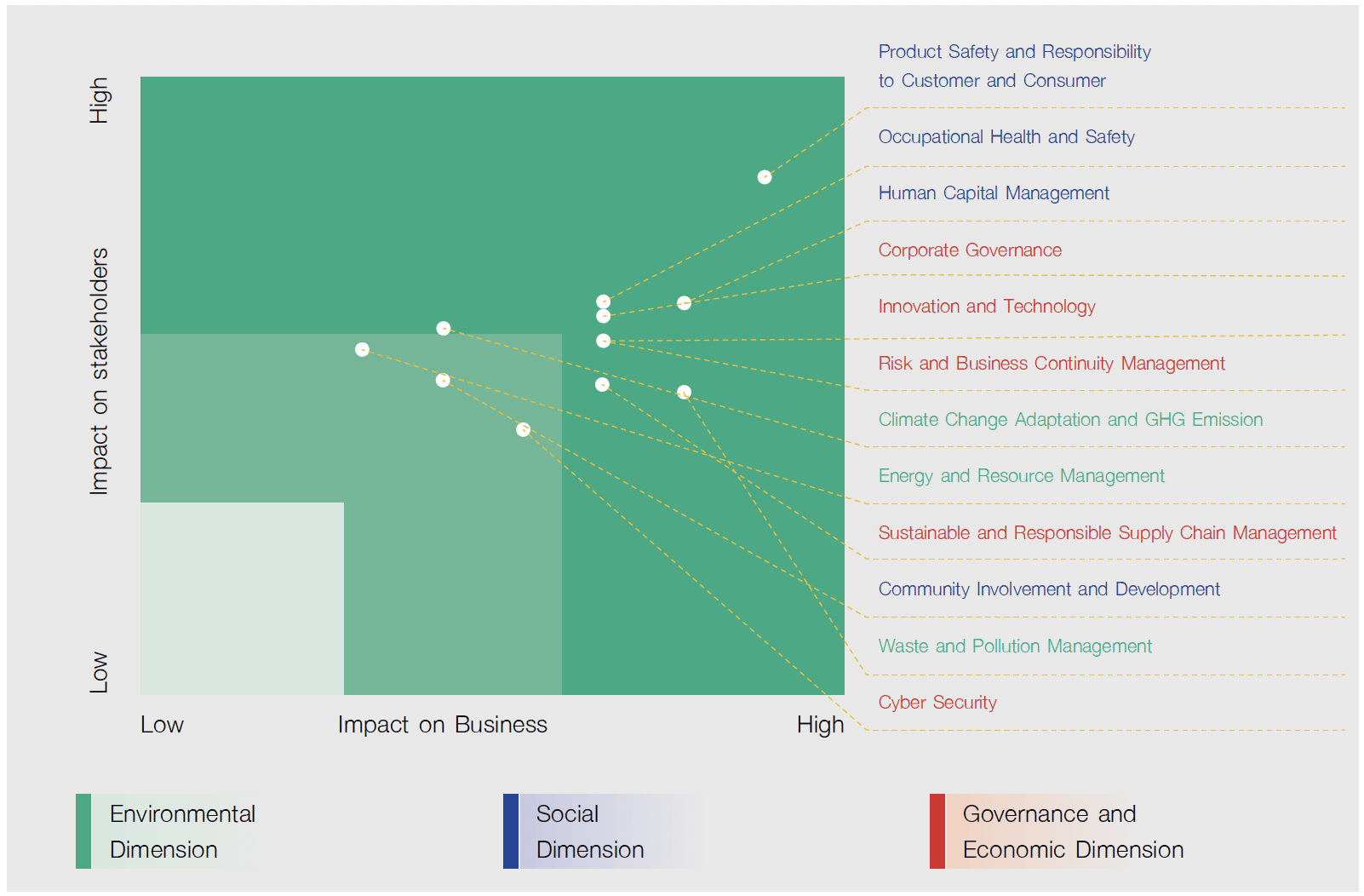 The Company assesses and ranks stakeholder relationships to set priorities for effective stakeholder management. The four most important stakeholder groups, based on their significant influence on the Company and direct impact from its activities, are customers and consumers, business partners, suppliers, and employees. Stakeholder groups with a significant influence but are indirectly affected by the Company include shareholders/investors, government agencies, regulatory agencies, and media.