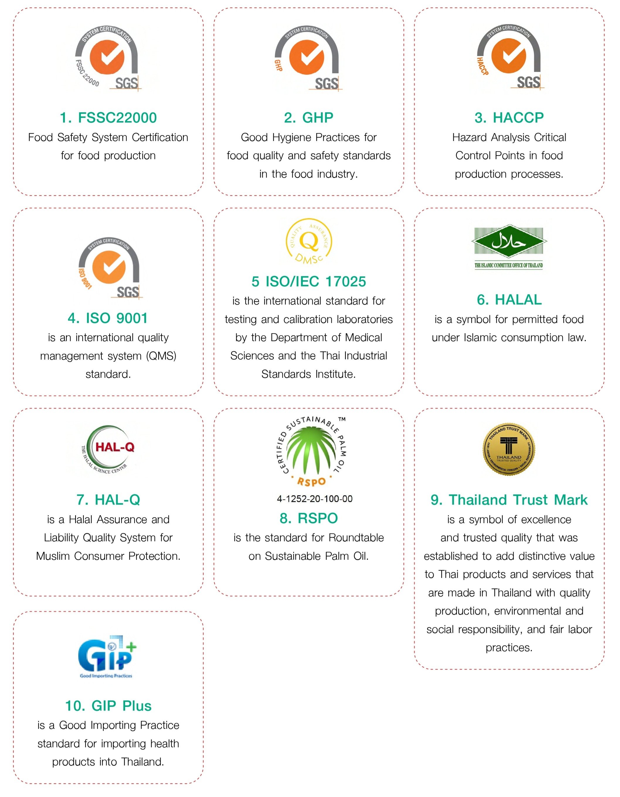 The Company has adopted international food quality and safety standards to foster customer and consumer confidence in its products, mitigate health risks, and respond to the demand for eco-friendly products. The Company is certified with the following certifications: