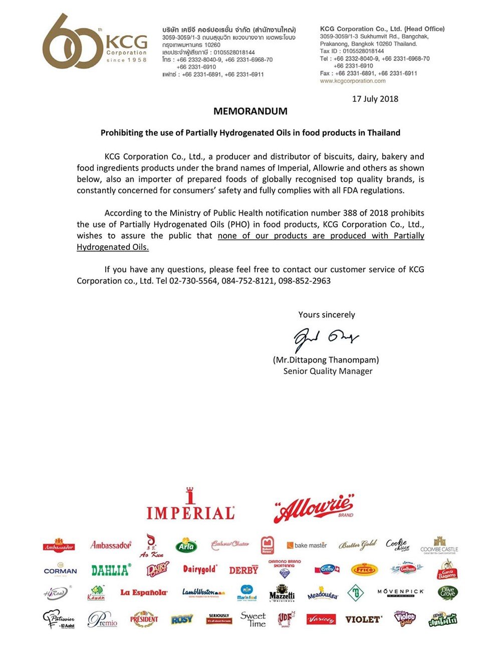 MEMORANDUM Prohibiting the use of Partially Hydrogenated Oils in food products in Thailand