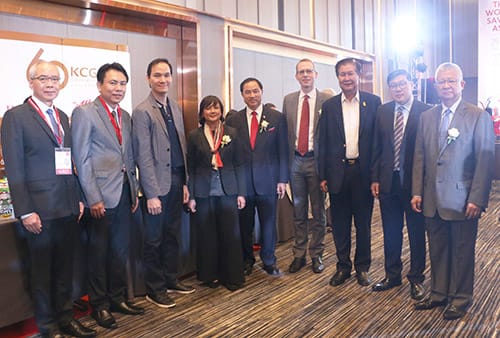 "Kalin Sarasin" (center), Chairman, the Thai Chamber of Commerce, "Bhumindr Harinsuit" (third from right), Vice Chairman, discuss KCG's operation and products with "Weerayut Kusolsongserm" (third from left), Vice President of Corporate Communications (KCG)