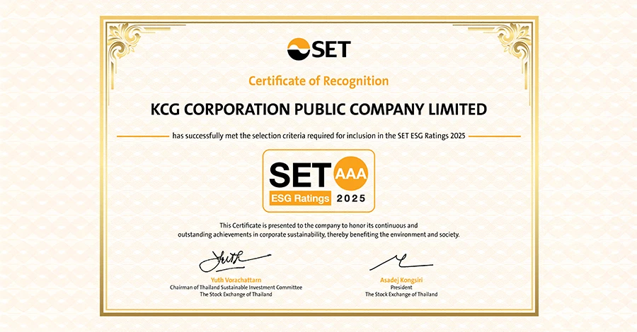 บริษัท เคซีจี คอร์ปอเรชั่น จำกัด (มหาชน) หรือ KCG ประกาศความสำเร็จด้านความยั่งยืนด้วยการคว้าผลประเมินหุ้นยั่งยืน SET ESG Ratings ประจำปี 2568 ในระดับสูงสุด AAA จากตลาดหลักทรัพย์แห่งประเทศไทย ตอกย้ำความเป็นผู้นำด้านผลิตภัณฑ์อาหารตะวันตกเพื่อโมเดิร์นไลฟ์สไตล์ที่ขับเคลื่อนธุรกิจด้วยความยั่งยืนอย่างแท้จริง หลังจากได้รับ รางวัล Commended Supply Chain Management Award จากงาน SET Awards 2025 ในกลุ่มรางวัล Sustainability Excellence สะท้อนความสอดคล้องและบูรณาการของกลยุทธ์ด้านความยั่งยืนเข้ากับกลยุทธ์และพันธกิจทางธุรกิจขององค์กรที่เป็นรูปธรรมอย่างต่อเนื่อง