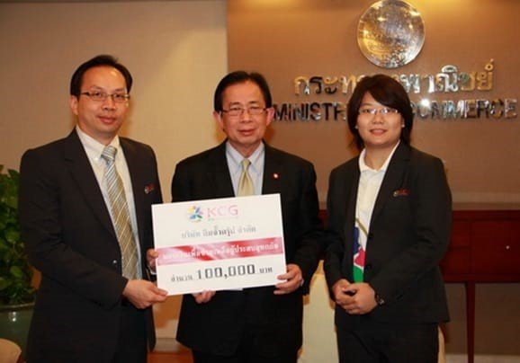 "Pumin Dhiranusornkit" (left) EVP – International Business of KCG Kim Chua Group also contributed THB 100,000 at the Ministry of Commerce to support flood victims.KCG is a leading importer of premium cheese, butter, and convenience food from numerous countries worldwide. The company is also Thailand's major producer and distributer of consumer products, including Imperial biscuits, Allowrie cheese and butter, and Sunquick fruit juice.
