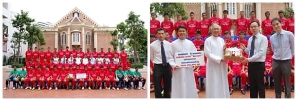 "Pumin Dhiranusornkit" (right) SVP – International Business of KCG Kim Chua Group offered a scholarship of THB 200,000 and additional gifts to "Paradaanun Preechawut" (left) Director of Assumption College as a support for the school's soccer team. As a token of appreciation, "Pumin Dhiranusornkit" also received a shield and jacket commemorating Assumption College's 125th anniversary. This took place at the fountain area in front of the Statue of Mary, Assumption College (Bangrak) on 16 September 2009.