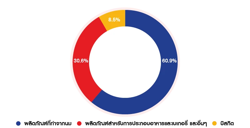 ตอบ บริษัทฯ เป็นผู้นำตลาดในกลุ่มสินค้าทั้งประเภทเนยและชีส โดยผลิตภัณฑ์เนยและสเปรด (Butter and Spreads) มีส่วนแบ่งตลาดอันดับ 1 อยู่ที่ 46.5% ผลิตภัณฑ์ชีส (Cheese) มีส่วนแบ่งตลาดอันดับ 1 อยู่ที่ 38.9% สำหรับผลิตภัณฑ์บิสกิตหวาน (Sweet Biscuits) มีส่วนแบ่งตลาดอันดับ 4 อยู่ที่ 6.1%