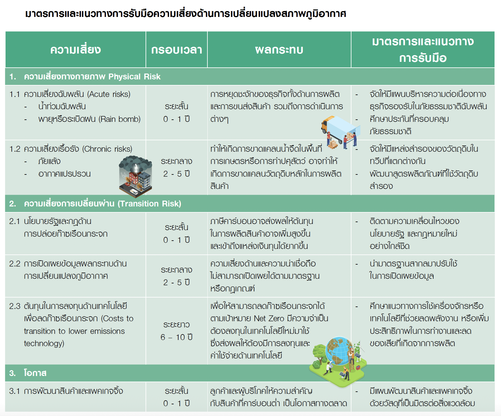 บริษัทฯ ประเมินความเสี่ยงจากการเปลี่ยนแปลงของภูมิอากาศ โดยศึกษาแนวทางของ Task Force on Climate-Related Financial Disclosures (TCFD) เพื่อใช้ในการระบุและประเมินผลกระทบเกี่ยวข้องกับสภาพภูมิอากาศต่อการดำเนินงานให้รอบด้าน ครอบคลุมความเสี่ยงและโอกาสจากผลกระทบของการเปลี่ยนแปลงสภาพภูมิอากาศทั้งในเชิงกายภาพ (Physical Risk) จากด้านภัยธรรมชาติที่รุนแรง เช่น น้ำท่วมฉับพลัน โรคติดต่อทั้งในพืชและสัตว์ พายุหรือระเบิดฝน (Rain bomb) ภัยแบบเรื้อรัง อาทิ ภัยแล้งที่ทำให้เกิดการขาดแคลนน้ำจืดในพื้นที่การเกษตรหรือการทำปศุสัตว์ อาจทำให้เกิดการขาดแคลนวัตถุดิบหลัก ซึ่งส่งผลกระทบต่อผลการดำเนินงานของบริษัท ที่ทำให้เกิดการหยุดชะงักของธุรกิจทั้งด้านการผลิตและการขนส่ง รวมถึงแนวโน้มต้นทุนการผลิตของวัตถุดิบการเกษตรที่สูงขึ้น สำหรับความเสี่ยงการเปลี่ยนผ่าน (Transition Risk) อาทิ นโยบายรัฐและกฎด้านราคาคาร์บอน การเปิดเผย ข้อมูลผลกระทบด้านการเปลี่ยนแปลงภูมิอากาศ ความเสี่ยงด้านชื่อเสียงหากไม่สามารถดำเนินการได้ตามที่ตั้งเป้าหมาย ในขณะเดียวกัน มีโอกาสในการพัฒนาสินค้าและแพคเกจจิ้งด้วยนวัตกรรมหรือเทคโนโลยีใหม่ ซึ่งบริษัทฯ ได้นำความเสี่ยงดังกล่าวเพื่อจัดทำมาตรการ รับมือและแผนรับมือที่เหมาะสมในอนาคตต่อไป