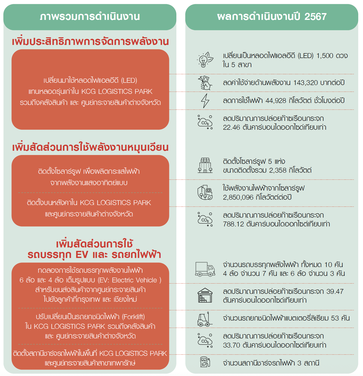 บริษัทฯ ได้ดำเนินแผนงานด้านสิ่งแวดล้อมและการบริหารห่วงโซ่อุปทาน เพื่อลดการปล่อยก๊าซเรือนกระจกขององค์กร ผ่านการเพิ่มสัดส่วนของพลังงานทดแทน โดยเฉพาะพลังงานไฟฟ้าแสงอาทิตย์และการจัดการห่วงโซ่อุปทาน โดยเฉพาะด้านการขนส่งและจัดเก็บตามแนวคิด Green Logistics เพื่อสอดรับกลยุทธ์ด้านสิ่งแวดล้อมและการจัดการพลังงานเพื่อลดก๊าซเรือนกระจก โดยมีโครงการดังนี้