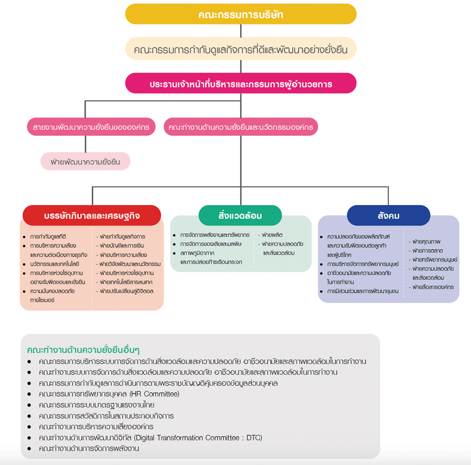 เพื่อการบริหารจัดการด้านความยั่งยืนได้อย่างมีประสิทธิภาพ คณะกรรมการบริษัทฯ ได้แต่งตั้งและมอบหมายให้คณะกรรมการกำกับดูแลกิจการที่ดีและพัฒนาอย่างยั่งยืนทำหน้าที่กำกับดูแลและกลั่นกรองการดำเนินกิจการด้านความยั่งยืน ทั้งด้านนโยบาย กลยุทธ์และเป้าหมาย แนวทางบริหารจัดการของบริษัทฯ ทั้งนี้ คณะกรรมการกำกับดูแลกิจการที่ดีและพัฒนาอย่างยั่งยืน ได้มอบหมายประธานเจ้าหน้าที่บริหารจัดตั้งคณะทำงาน ด้านความยังยืนและนวัตกรรมองค์กร และเป็นหัวหน้าคณะทำงานพร้อมประกอบด้วยผู้บริหารระดับสูงและตัวแทนหน่วยงานมาเป็นคณะทำงาน เพื่อขับเคลื่อนการดำเนินการในแต่ละประเด็นสำคัญของบริษัทฯ สู่การปฏิบัติจริงและสื่อสารสร้างความเข้าใจและความร่วมมือจากพนักงานทั่วทั้งองค์กร โครงสร้างการพัฒนาความยั่งยืนของบริษัทฯ มีดังนี้