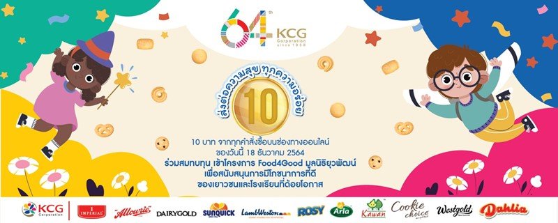 บริษัท เคซีจี คอร์ปอเรชั่น จำกัด ผู้นำด้านเบเกอรี่และอาหารตะวันตกของประเทศไทย ผู้ผลิตและจัดจำหน่ายสินค้าภายใต้แบรนด์ อิมพีเรียล และ อลาวรี่ และนำเข้าสินค้ากว่า 40 แบรนด์ชั้นนำทั่วโลก ตอกย้ำการเป็นผู้สร้างสรรค์ความรื่นรมย์ให้รสชาติ ขอส่งมอบประสบการณ์ความอร่อยให้แก่น้องๆที่ด้อยโอกาส ผ่านแคมเปญ “เคซีจี ชวนช้อปทำดี” ทุกยอดคำสั่งซื้อสินค้าผ่านช่องทาง Online ภายในวันที่ 18 ธันวาคม 2564 เคซีจี บริจาค 10 บาท สมทบทุนโครงการ FOOD FOR GOOD ในมูลนิธิยุวพัฒน์ เพื่อสนับสนุนการมีโภชนาการที่ดีของเยาวชนและโรงเรียนที่ด้อยโอกาส